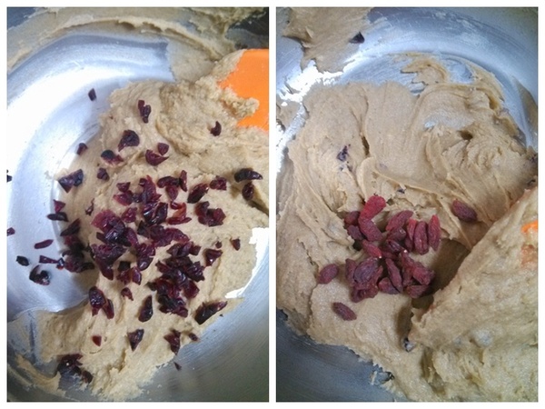 5、拌均勻之后加入切碎的蔓越莓;6、加入枸杞;