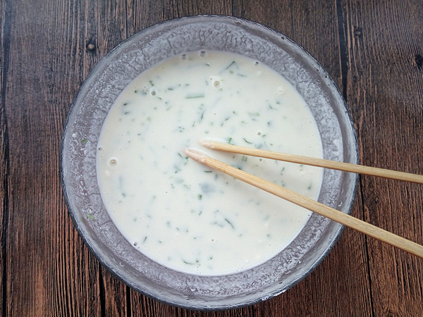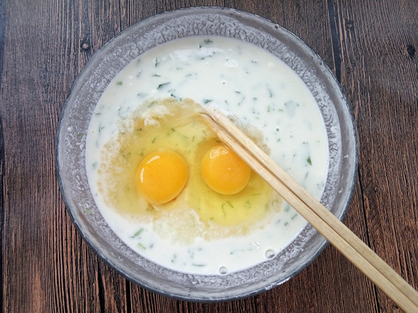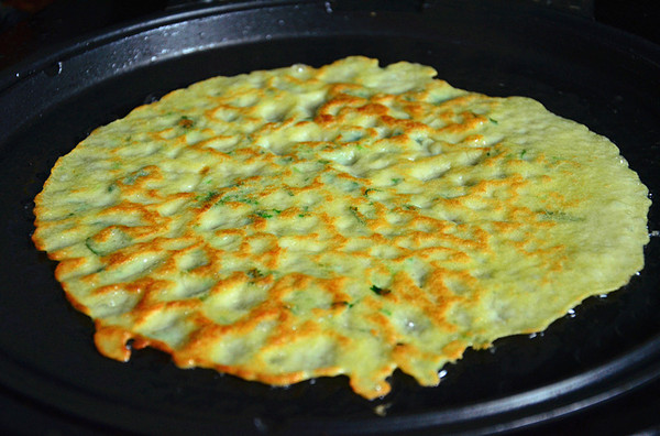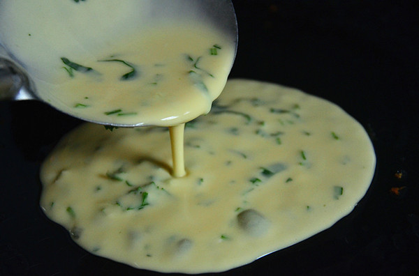 食材:面粉 130克 雞蛋 2個 水 280 克 香菜 一顆 鹽、雞精 適量 (這個量大約6張餅,兩個人的量,一人吃可減半)