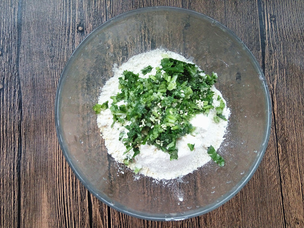 一、將面粉加入碗內(nèi),香菜洗凈切碎加入面粉中,不喜歡香菜的可以換成蔥花