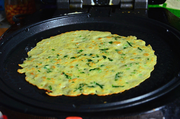 五、將電餅鐺抹油預(yù)熱,舀一勺面糊倒在電餅鐺中間,稀面糊會自動散開來