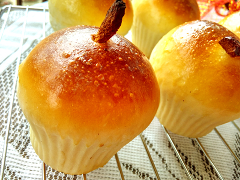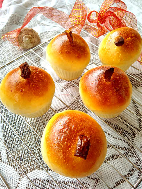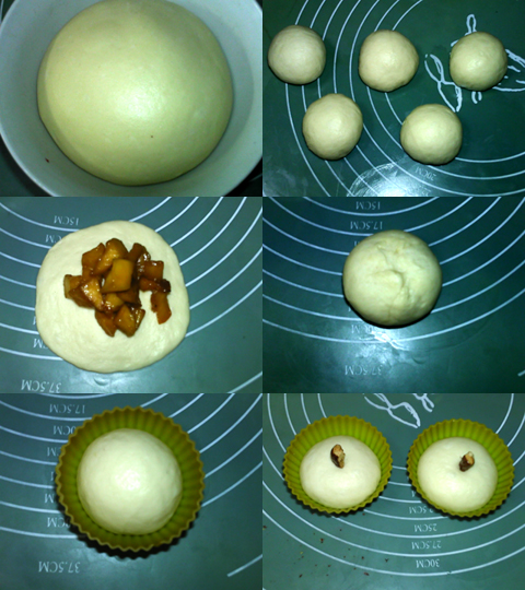 面團長大至兩倍。排氣,分割成5等分,滾圓,松弛15分鐘。搟成圓餅狀,放入蘋果粒。包好,捏緊收口。收口向下,放入馬芬模中。紅棗切條,插在面團上。進行最后發(fā)酵。