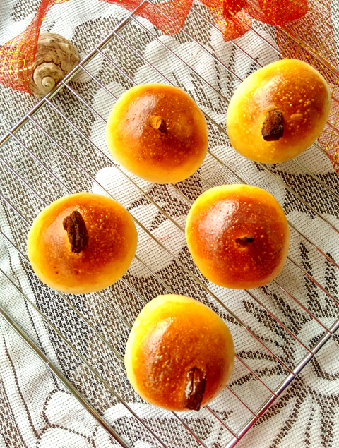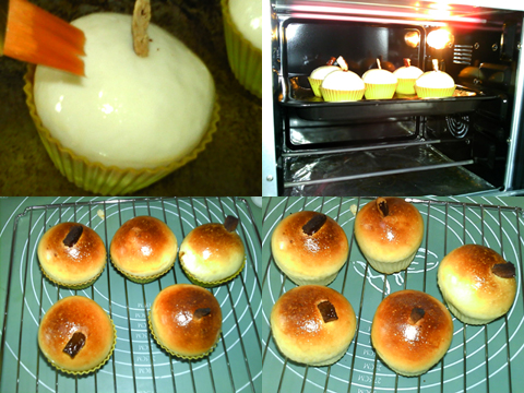 面團長大,表面刷蛋液,放入烤箱,中層,上下火150度,烤約15分鐘左右,表面金黃,出爐。立即脫模,晾涼。