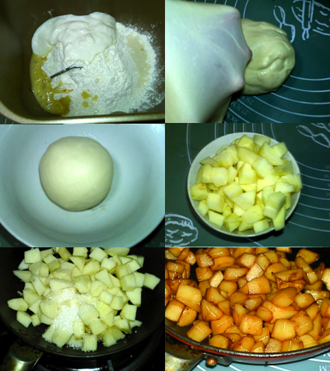 將所有面團料倒入面包機,啟動和面程序。攪拌至能拉出薄膜。放入大碗,進行基礎發(fā)酵。蘋果洗凈去皮核蒂把,切丁,放入鍋中,加糖,中小火翻炒。湯汁收干,蘋果呈焦糖色。熄火,冷卻備用。