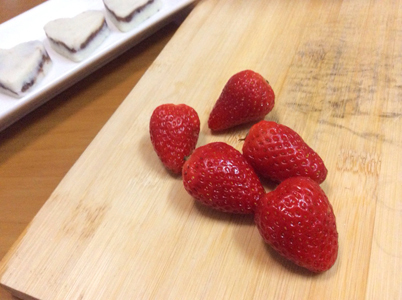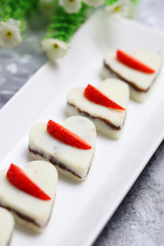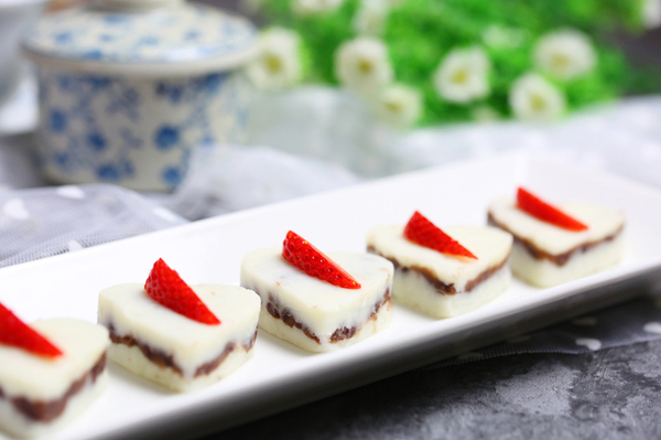 8、洗凈草莓去蒂,切成小片,放在淮山紅豆糕上即成。