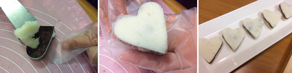 6、取心型模具,放一層淮山泥壓緊,中間放紅豆沙,再放一層淮山泥壓緊。