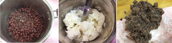 4、將煮好的紅豆和白糖倒入小鍋里,開大火煮滾后改小火,一邊攪拌一邊熬制,待紅豆水分蒸發(fā)后變得干身即可(要不斷攪拌避免紅豆泥粘底)。
