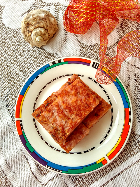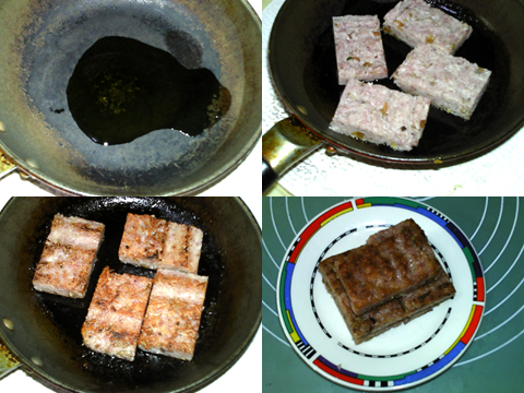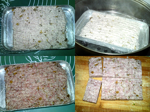 鋪在刷油的盤子上,壓實。放入沸水鍋中,大火蒸15分鐘。熟透后出鍋,冷卻后放入冰箱冷藏過夜。取出,切成大小相等的塊。