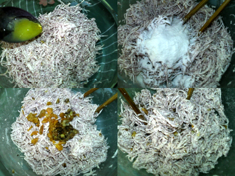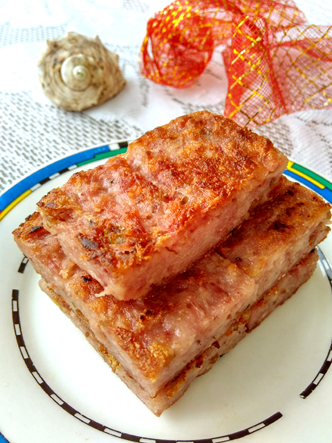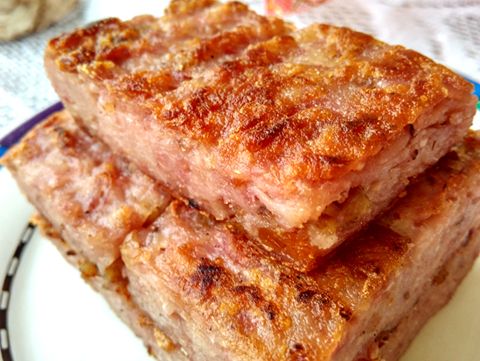 芋頭擦絲,據說是越細越好。所有材料混合在一起蒸熟,香芋立馬就呈現(xiàn)出漂亮的紫色。不急著吃,就放冰箱過夜,再來切塊煎。據說,這樣才不會散開。