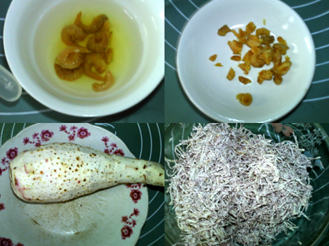 海米洗凈,用溫水泡發(fā)。切碎,備用。芋頭洗凈去皮。刨成細絲,加入鹽,油,拌勻。加入米粉,拌勻,讓芋頭絲均勻地粘上米粉。加入海米粒和肉臊,拌勻。
