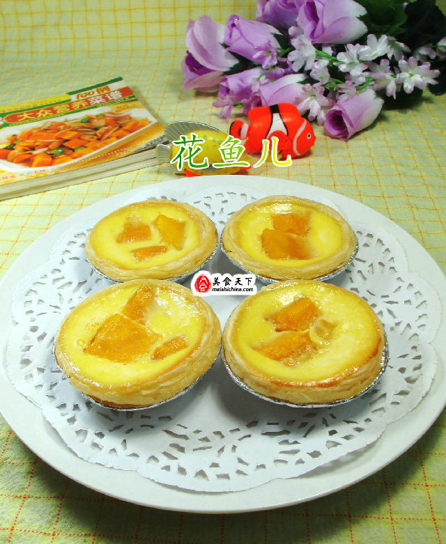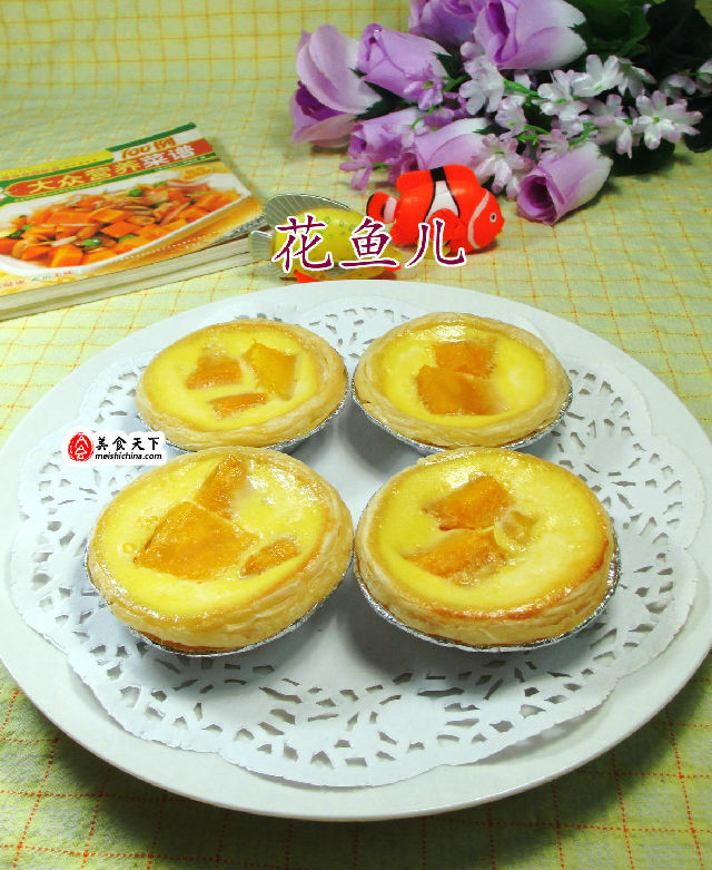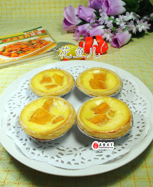 食材:蛋撻皮10個(gè)、雞蛋2只、芒果185克(已去皮切開)、牛奶70克、綿白糖10克、煉乳、低筋面粉5克