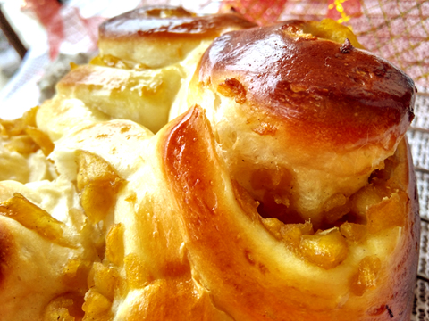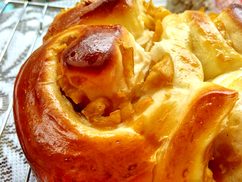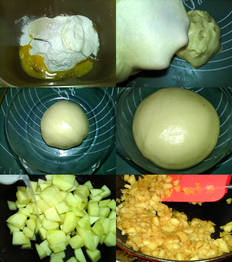 將所有面團料倒入面包機中,啟動和面程序。攪拌至能拉出薄膜。滾圓,放入大碗,進行基礎(chǔ)發(fā)酵。至面團長大至兩倍。蘋果去皮核蒂把,切小丁,放入鍋中,加水,中小火熬煮。水分收干,蘋果變得粘稠。熄火,備用。