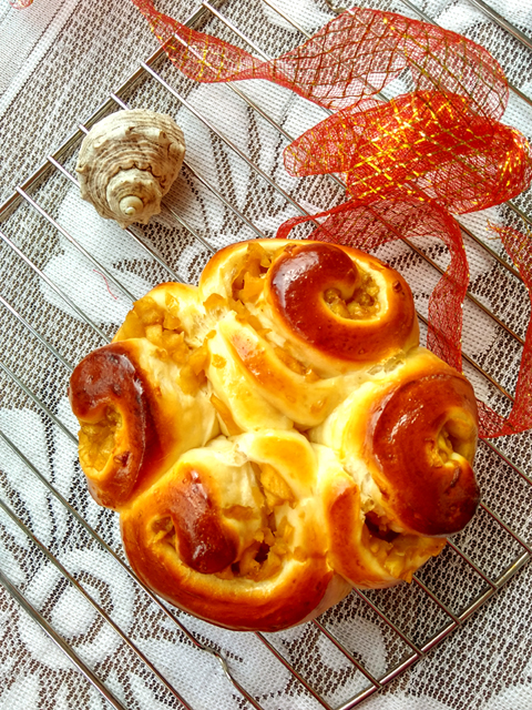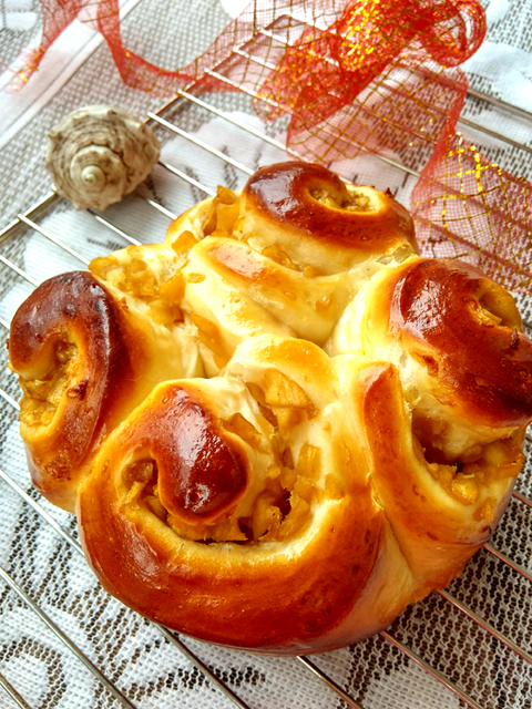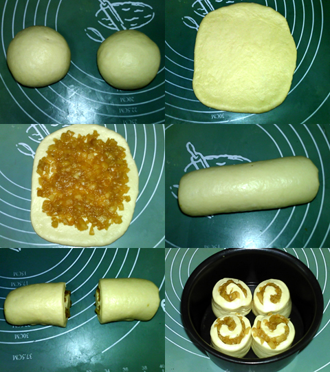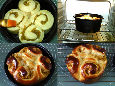 排氣,分割成2等分,滾圓,松弛15-20分鐘。搟成長方形。鋪上蘋果餡。卷起,收口向下。切成兩等分。切口向上,放入六寸圓模中。進行最后發(fā)酵。