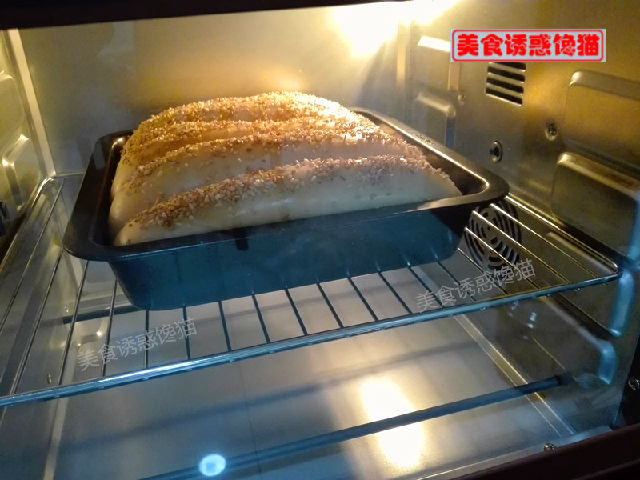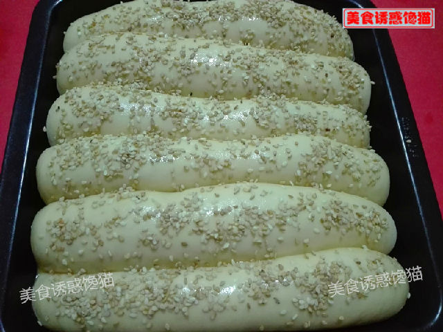 8、發(fā)酵至滿模(二倍大),表面刷蛋液,撒一層芝麻。