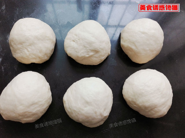 3、發(fā)酵好后將面團(tuán)排氣,均分為6份。
