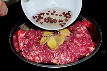 2、加花椒汁、姜片、鹽、料酒碼味一個小時