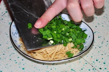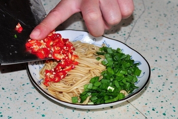 9、煮熟的面條撈起瀝干水分放入碗中快速和調(diào)料拌勻