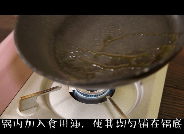 3,鍋內(nèi)加入食用油,轉(zhuǎn)動(dòng)鍋使其均勻的鋪到鍋底,倒入攪拌好的面糊,使其均勻攤開在鍋底