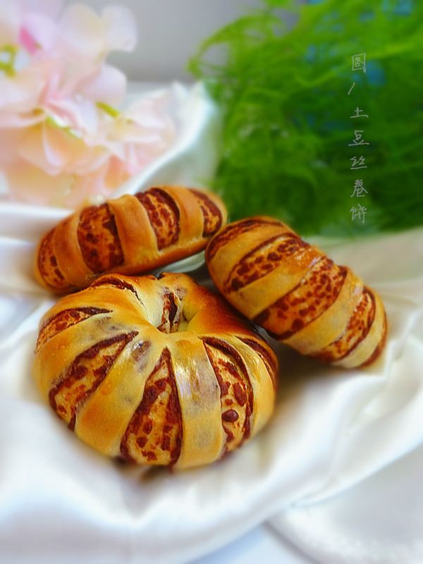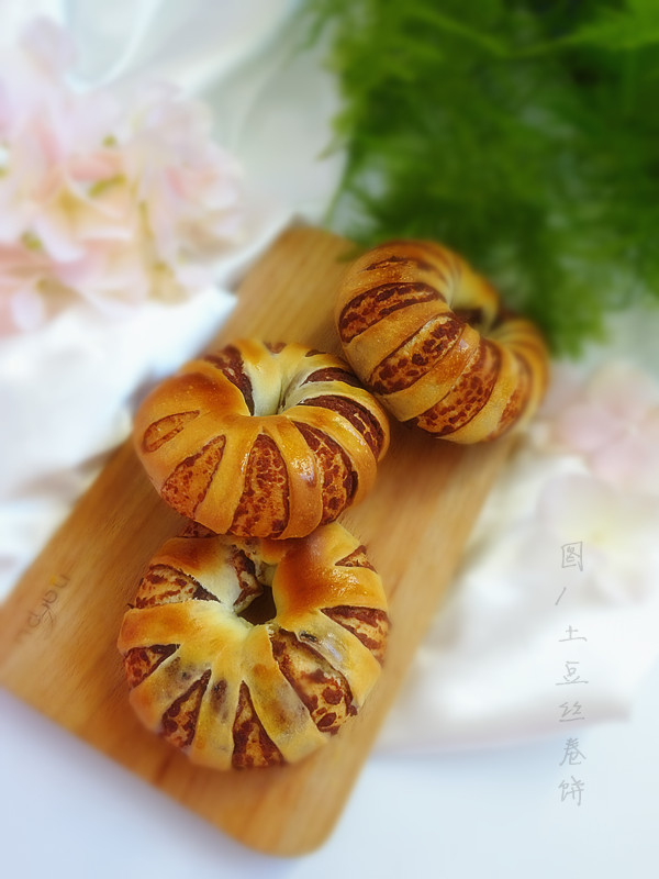 10、兩頭往中間合攏,把其中一頭卷緊些,插入另一頭捏緊捏實(shí),放入烤盤,蓋好,二次發(fā)酵。