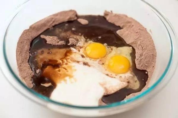 1、準(zhǔn)備三個(gè)個(gè)大碗,在其中一個(gè)碗中將可可粉、酸奶油、雞蛋和香草精混合均勻