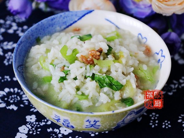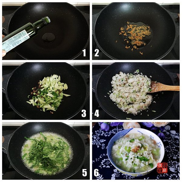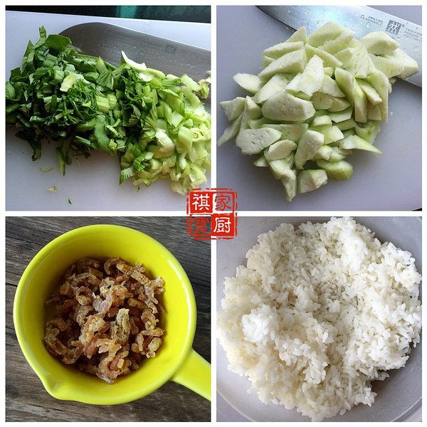 食材都是順手拈來(lái)的,青菜、絲瓜、開(kāi)洋、隔夜的冷飯、橄欖油、鹽、雞精(介意的可不加)。