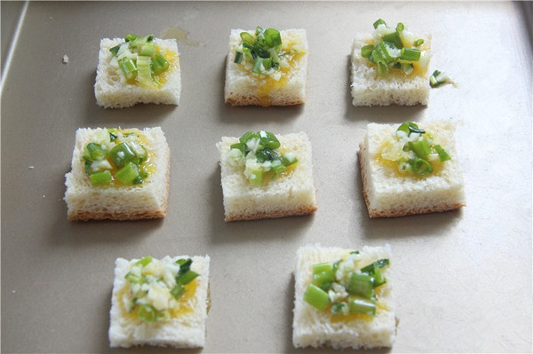 5、將吐司面包片鋪在烤盤上,鋪上一層黃油蒜蓉醬