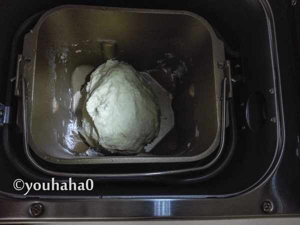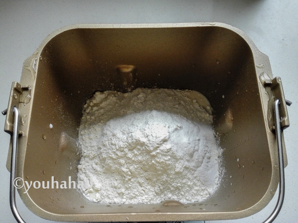 3、所有的食材全部放入面包機桶中,放入順序是先液體、酵母后粉類,鹽最后放
