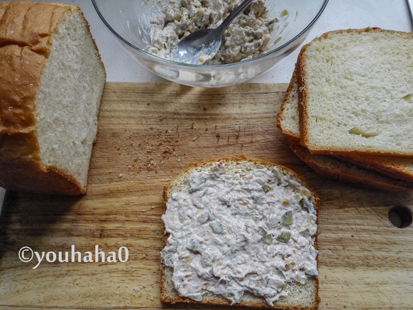 8、酸黃瓜切小丁與沙拉醬金槍魚拌勻,面包切片涂抹金槍魚沙拉醬,蓋上一片面包,切掉周邊,對切開即可,配一杯豆?jié){或牛奶,健康營養(yǎng)早餐