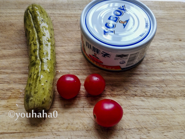 7、準備材料做三明治的夾餡,酸黃瓜一根、沙拉醬金槍魚一罐,圣女果擺上未用
