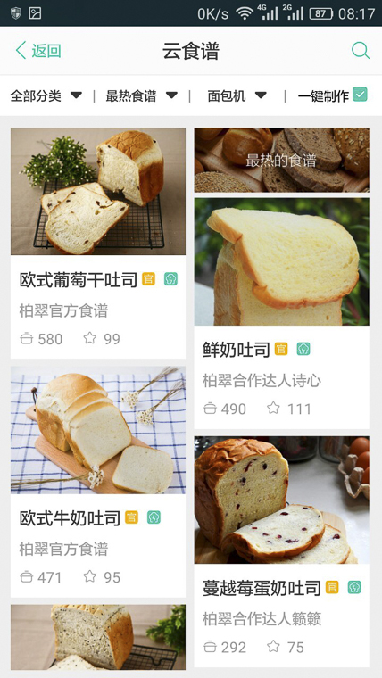 2、啟動云食譜,選擇其中的歐式牛奶面包,點開后出現(xiàn)操作步驟及配料,按照配料表中的要求準備材料