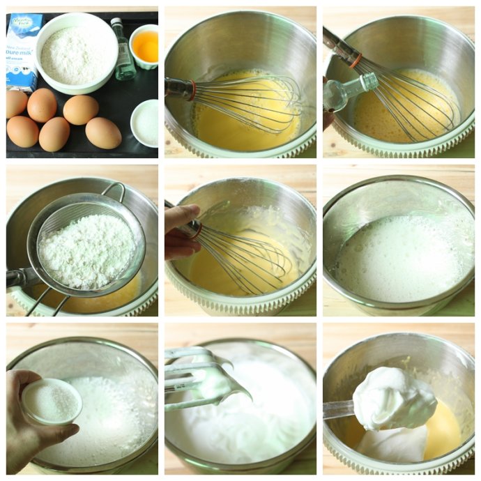 3. 取1/3蛋白霜到蛋黃糊中用刮刀輕輕翻拌均勻(不要劃圈,以免消泡)