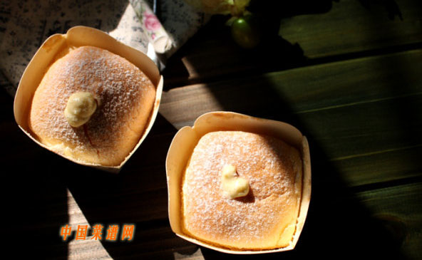 11 花嘴插入蛋糕內(nèi)部擠入(蛋糕表面微微鼓起即可,太多的話會使蛋糕脹裂),表面再篩少許糖粉裝飾即可