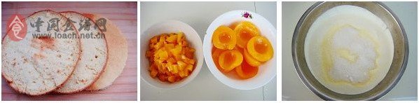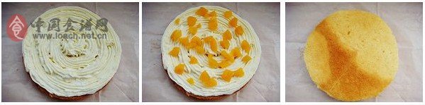 5、蓋上一片蛋糕片,再擠滿打發(fā)的鮮奶油撒黃桃粒。依次做好三層。