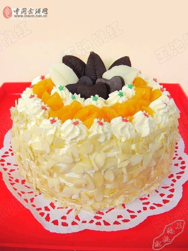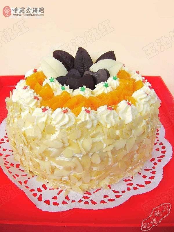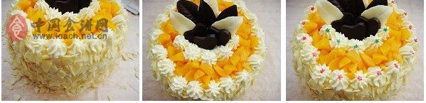 7、我在蛋糕的周圍擠了一圈花紋,然后放一圈黃桃粒,再擠一圈花紋,最里面放了我自己用白巧克力和黑巧克力做好的樹葉和心形巧克力塊,用彩色巧克力星放在了每個花紋上。