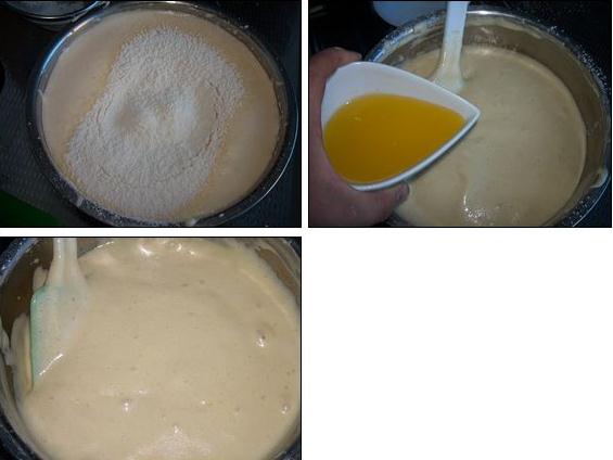 2、低筋粉提前過篩兩遍,然后篩入蛋液中,用翻拌的方式拌均勻,千萬不要花圈攪拌以免消泡。之后加入隔水融化開的黃油,依然是翻拌的方法拌均勻,不能有