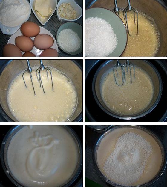 3、烤盤中鋪上油紙,倒入蛋糕糊,用力震兩下,震出氣泡,也使得表面平整,然后撒上一層杏仁,