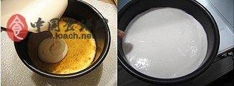 4.取1/3蛋白霜加入蛋黃糊中翻拌,再取1/3蛋白霜與其混合翻拌均勻.倒回剩余的蛋白霜中撈拌均勻,倒入模具中,輕震兩下