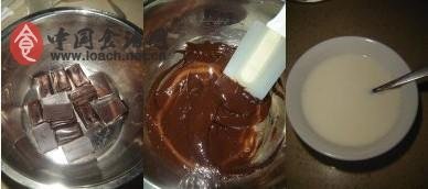1、黑巧克力裝入盆中,隔熱水融化,拌勻;