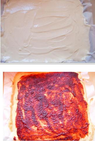 5:把油紙平鋪在烤盤內(nèi),把蛋糕糊平鋪在上面