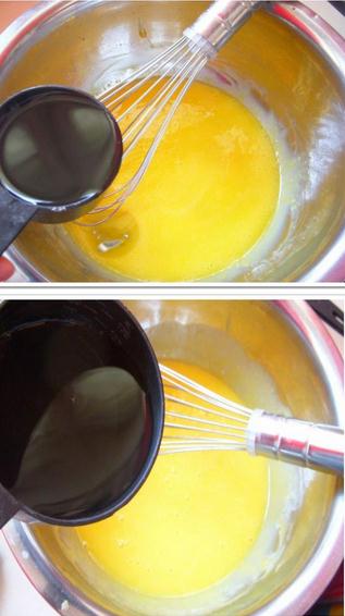 1:蛋黃加油攪拌均勻,加入清水拌勻