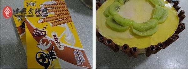 1、用電吹風沿著模具周圍吹一會,或者用熱毛巾捂一會就能脫模了。取出蛋糕,在周圍粘上蛋卷。擺上