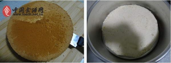 1、戚風蛋糕裁下兩個約2CM厚的薄片,修剪一圈。一片比八寸活底模略小一點,另一片再小一點。稍大的蛋糕片放到模具里。
