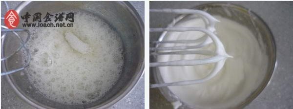 白醋打發(fā),分三次加入白糖,打至干性發(fā)泡,提起打蛋器糖蛋白呈直立小三角狀。