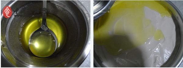 2、蛋黃攪勻,加牛奶和油攪勻。加入過篩的低粉,拿橡皮刮刀用切拌的方式拌勻,拌成蛋黃糊。