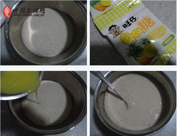 原料:牛奶240克、中等大的香蕉2個、菠蘿味QQ糖125克、淡奶油400克、白糖10克。