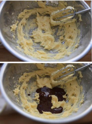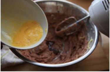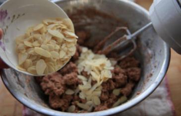 2,往盆中倒入融化的巧克力液迅速打勻,再分2-3次加入蛋液打勻;香香脆脆停不了口---杏仁片