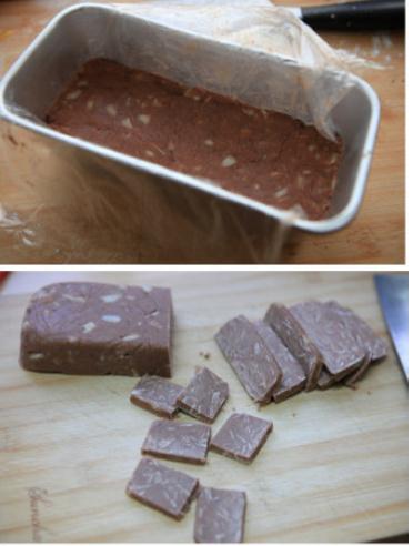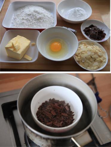 烤箱預(yù)熱到100度關(guān)掉,然后把切成小丁的黃油連盆子一起放入烤箱中,一小會(huì)兒黃油就會(huì)軟化取出),巧克力切成碎屑放在開水鍋中隔水融化;香香脆脆停不了口---杏仁片巧克力
