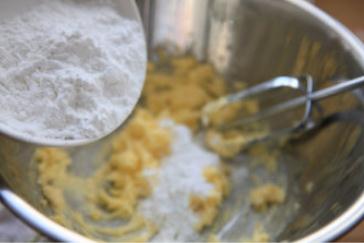 1,黃油切小丁室溫軟化后分次加入糖粉打至顏色變淺體積變大(現(xiàn)在是寒冷的冬季,黃油不易軟化,我通常是把
