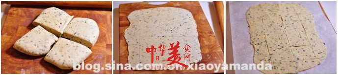 烘焙紙上,用叉子扎一些眼,再薄薄的撒一層海鹽,縱橫切割成喜歡的大小