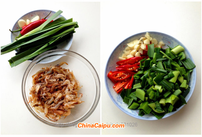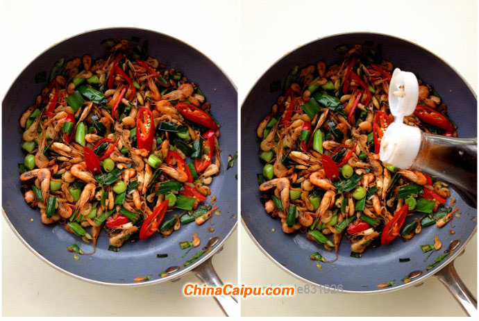 2. 炒至河蝦變色,放入青蒜和紅辣椒;