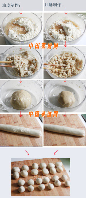4 同樣,將油酥的面團(tuán)也搓成長(zhǎng)條,分成12等份,將每個(gè)小劑子搓圓;